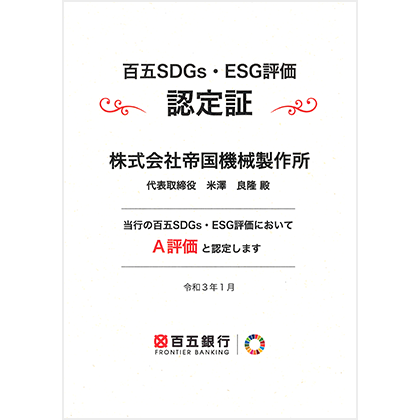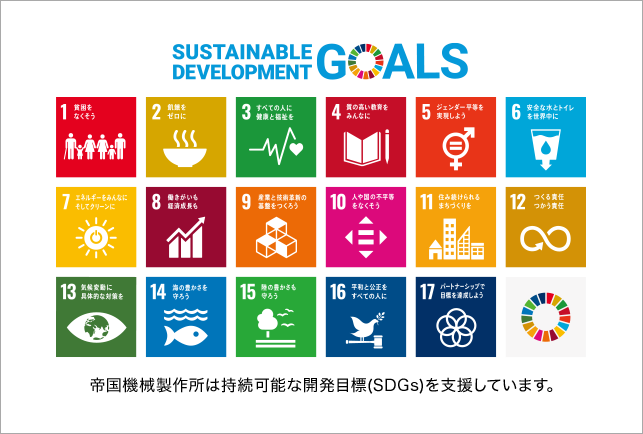 株式会社 帝国機械製作所は、国連が提唱する「持続可能な開発目標」に賛同し、持続可能な社会の実現に向けて努力していくことが重要だと考えます。